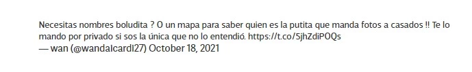 Al leer esto, la respuesta lapidaria de Wanda no se hizo esperar: "¿Necesitás nombres boludita ? O un mapa para saber quien es la putita que manda fotos a casados !! Te lo mando por privado si sos la única que no lo entendió", lanzó sin filtros en la red del pajarito.