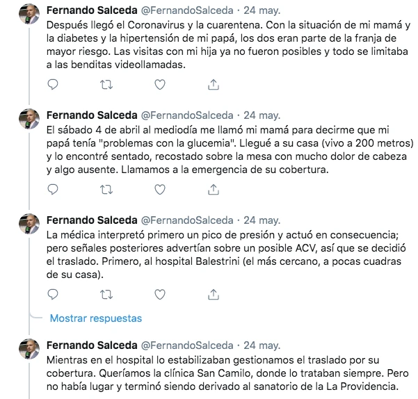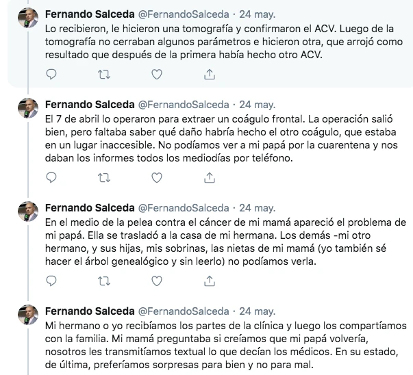 Pero enseguida avisó que el “hilo” sería “triste”. Y vaya que lo fue. Salceda contó que sus padres eran población de riesgo, por edad y por trastornos de salud que sufrían ambos. Su mamá, incluso, transitaba un procedimiento oncológico con un pronóstico desfavorable.