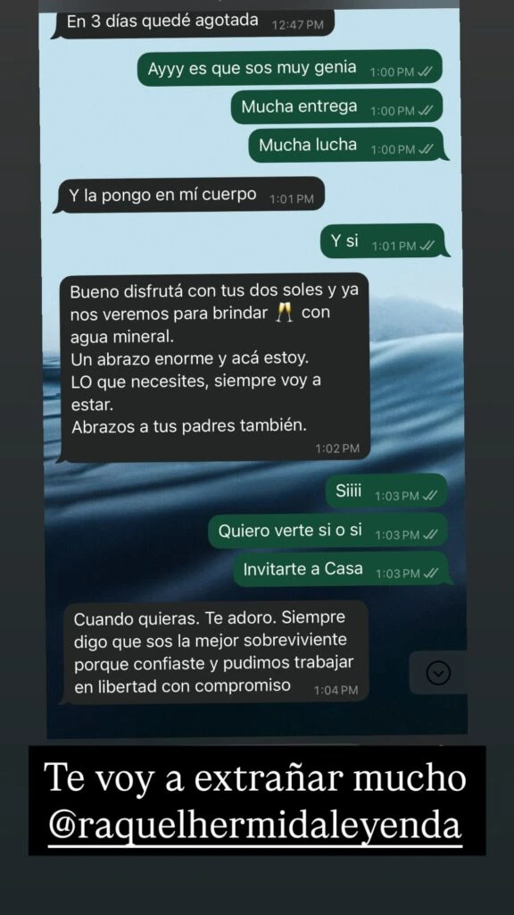 “Acá estoy, para lo que necesites, siempre”, le decía Raquel, quien destacaba la valentía de Calu de haber enfrentado a Darthés. “Te adoro, siempre dije que sos la mejor sobreviviente porque confiaste y pudimos trabajar en libertad con compromiso”, se lee en otro tramo de los chats. “Te voy a extrañar mucho, gracias”, agregó Calu, a modo de despedida de su querida abogada quien estuvo a su lado en sus momentos más difíciles.