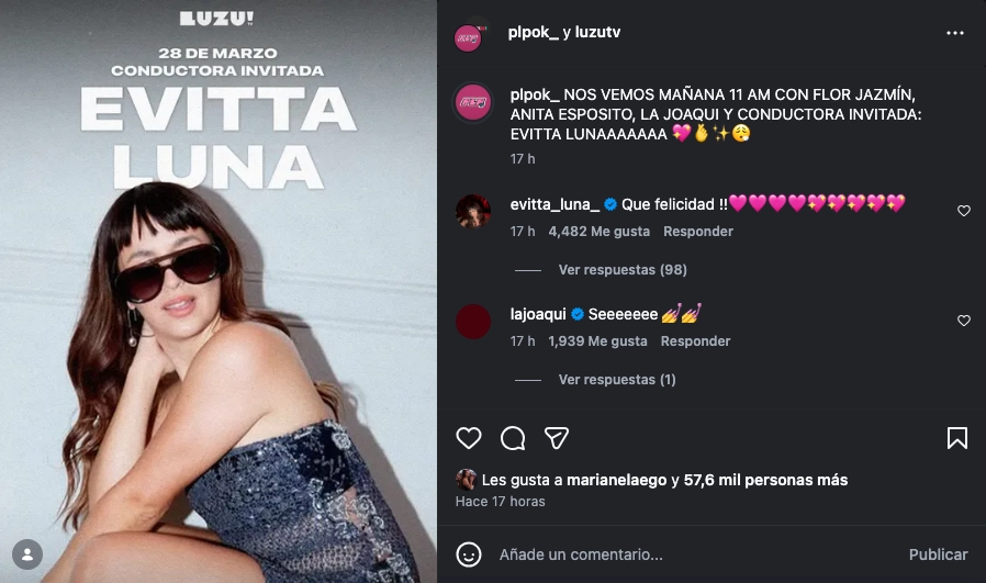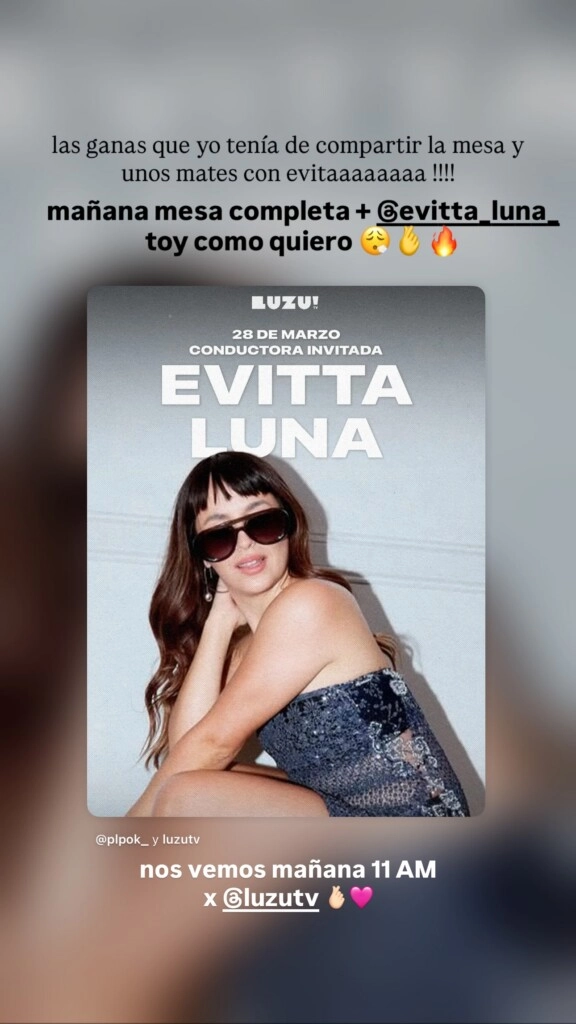 ¿Qué pasó ahora? Este sábado en Luzu anunciaron la llegada de Evitta Luna, que hasta el año pasado fue conductora de Olga y se fue en términos no muy claros. Y si bien en el canal de Nico la anunciaron como invitada a PLP -el ciclo de Flor Jazmín Peña, La Joaqui y Anita Espósito-, desde la comunidad pidieron que la streamer quede fija. ¿Será una incorporación definitiva?