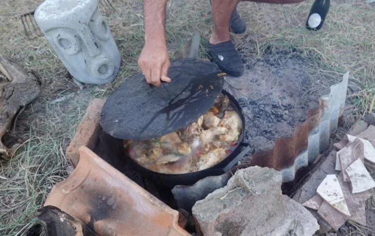 No faltaron momentos de desconexión total al aire libre. Preparó un guiso rústico sobre un fuego improvisado con ladrillos y chapas, mientras la olla de hierro burbujeaba bajo la tapa. Rosemblat apareció en otra postal conduciendo despreocupado con el torso desnudo.