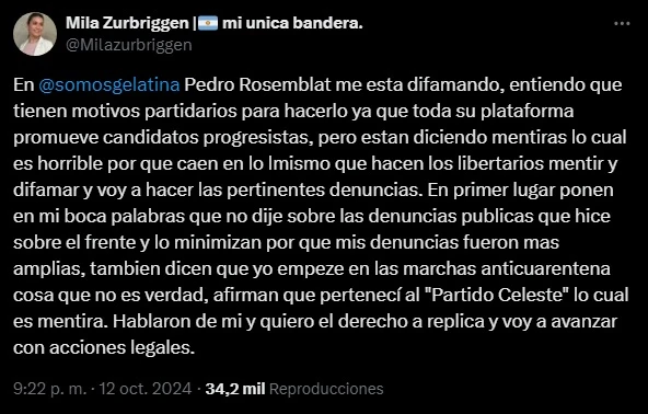 “Pedro Rosemblat me está difamando, entiendo que tienen motivos partidarios para hacerlo ya que toda su plataforma promueve candidatos progresistas, pero están diciendo mentiras lo cual es horrible porque caen en lo mismo que hacen los libertarios, mentir y difamar, y voy a hacer las pertinentes denuncias”, comenzó diciendo.