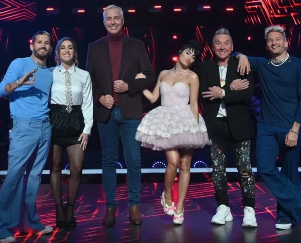 Lali sorprendió a todos con el atuendo que sus vestuaristas eligieron para ella para esta etapa: un vestido corto strapless en blanco y rosa, con volados, muy estilo “princesa de Disney”, que acompañó con un peinado recogido, una gargantilla de brillantes y ballerinas blancas con moños rosados.