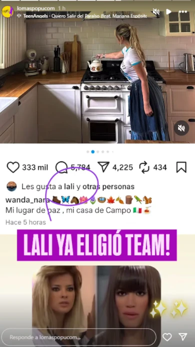 Con tan solo poner un corazoncito, un click, Lali hizo toda una declaración que, hoy por hoy, la posiciona más cerca de Wanda que de la actriz a quien conoció de chiquita en Rincón de Luz. “Lali ya eligió team!”, advirtió la cuenta @lomaspopu al notar que la artista había dejado su marca el último posteo de Wan.