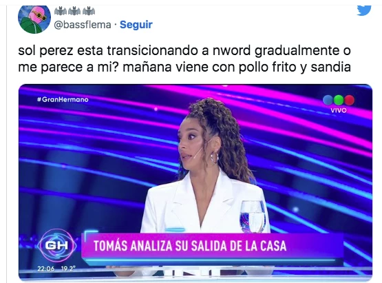 En definitiva, los usuarios postearon mensajes contra Sol como: “¿Eres africana Sol Perez?”, “Amiga, la humedad en estos días me está matando, no se diga más”, “Amo que Sol Pérez que representa a una etnia distinta en cada programa”. Y muchas otras comparaciones que pulularon por las redes.
