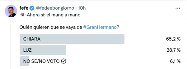 Un triunfo esta noche la catapultaría como gran candidata. Sería como dar un golpe fuerte en la mesa y sentarse allí junto a los otros favoritos. Tato, Eugenia, Ulises por ejemplo. Y según el sondeo que se apuró en hacer Fefe Bongiorno, el máximo experto de Gran Hermano en la Argentina, es algo que podría suceder. Hasta el momento, con una avalancha de votos ya recolectados, Luz tiene el 28,7 por ciento y Chiara nada más y nada menos que el 65,2 por ciento. ¿Todo decidido? Parece, parece que Chiara tiene un pie y medio afuera, pero con Gran Hermano nunca se sabe.