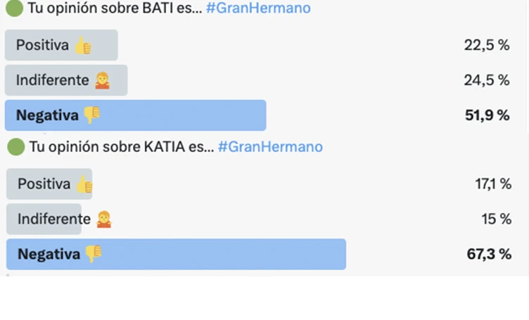 Marcelo (33%) y Selva (27,4) no se ven taaaan aliviados pero tampoco tan comprometidos. Parece difícil que deban agarrar la valija y emprender el doloroso camino de la despedida. Después vienen los que empiezan a estar más comprometidos, puestos en los que se ubican Gabriela (24,7%), Luciana (23,4 % pero con el escándalo de Bati comiéndole aceptación, guarda) y Bati (22,5%) y allí aparecen los más comprometidos y, al menos en este relevamiento, los que aparecen con mayores chances de eliminación: La Tana Katia con 17,2% y Lorenzo con apenas 5,8%, a quien parece que solo un milagro podría salvarlo.
