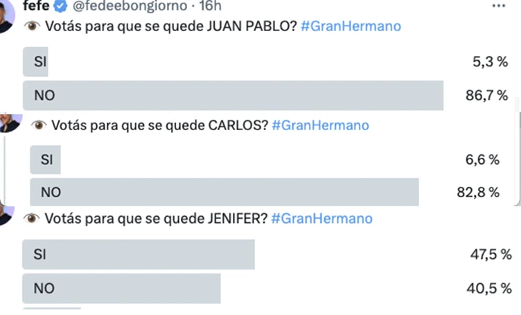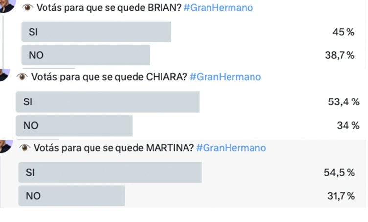 En cuanto a los muchachos, Brian y Santiago no es que están salvados (siempre se aclara que son "sondeos" o "relevamientos" y que la verdad de la milanesa está en los votos que recibe Telefe) pero sí mucho menos comprometidos que los dos que están palo y palo entre la guadaña y seguir lo menos una semana más, Juan Pablo y Carlos. A cada hora la cosa cambia, y al momento de escribir este texto Carlos tenía el 82,8% de gente diciendo que no votaría para que se quede y Juan Pablo el 86,7%, por lo que es el que más cerca está de la puerta. Eso en Twitter, porque en Insta siguen últimos pero con Juan Pablo unos votos por encima de Carlos.