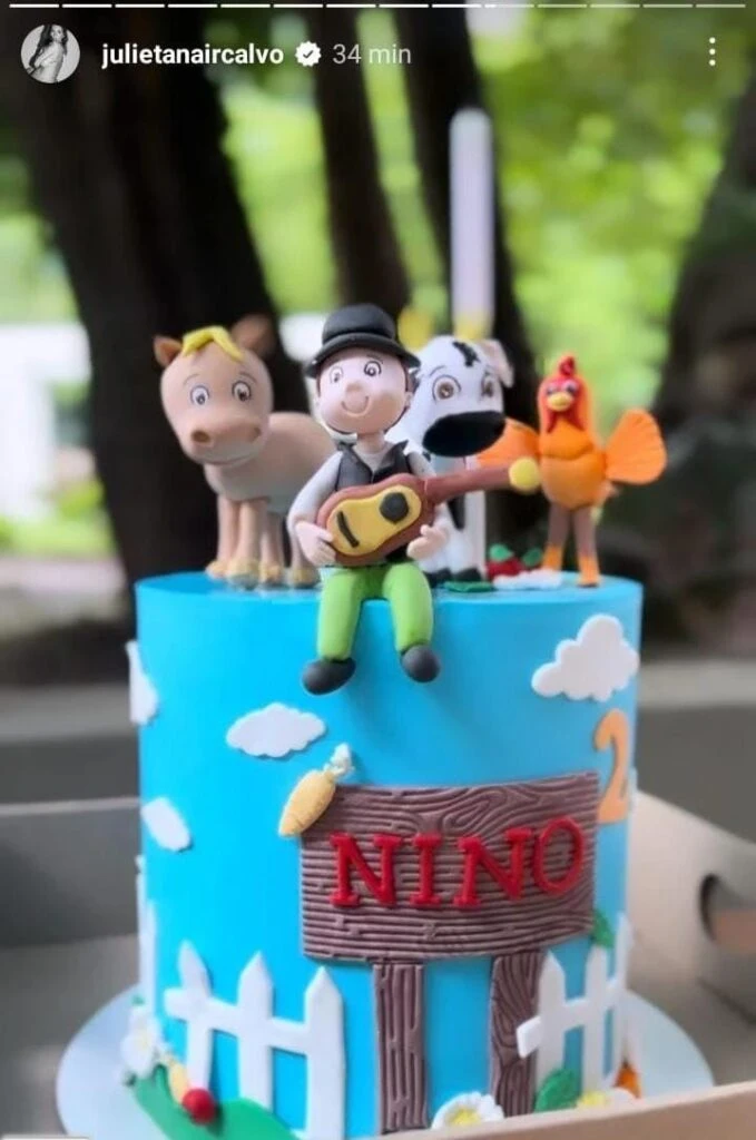 Las imágenes revelan una atmósfera festiva adornada con detalles de granja, donde la torta principal se destacaba con figuras de animales como vacas, caballos y gallos, realizadas en mazapán, mientras que el nombre "Nino" añadía un toque personalizado.