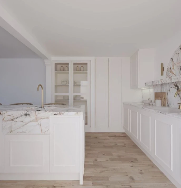 En lo que respecta a muebles, el espacio central cuenta con una mesa en el comedor para seis personas, sumado a un sillón estilo chesterfields y otros dos individuales que ocupan parte del living, en combinación con las tonalidades cálidas del espacio.