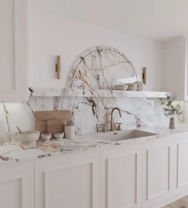 Siguiendo la misma línea, el living respeta el cartel de entrada con una barra de tragos, con una colección de botellas, y cristalería, en compañía de una combinación entre madera, marmol y unas paredes en la tonalidad de los rojos.