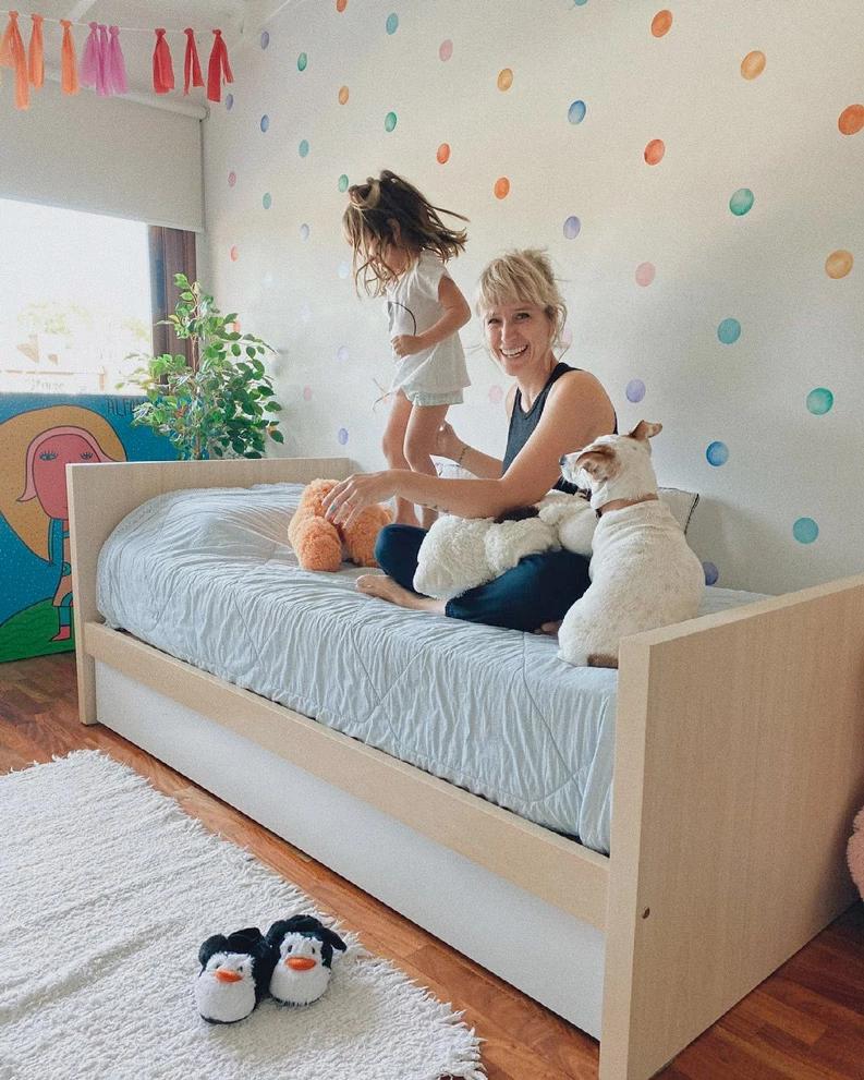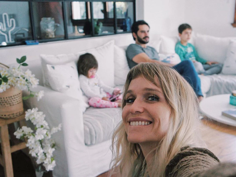 El living se erige en uno de los ambientes predilectos de Gandini y Gonzalo, porque la mayoría de sus posteos tienen como escenografía ese espacio fantástico, en el que luce una pared de ladrillo a la vista y los sillones gigantes y mullidos, donde se entregan a retozar y jugar.