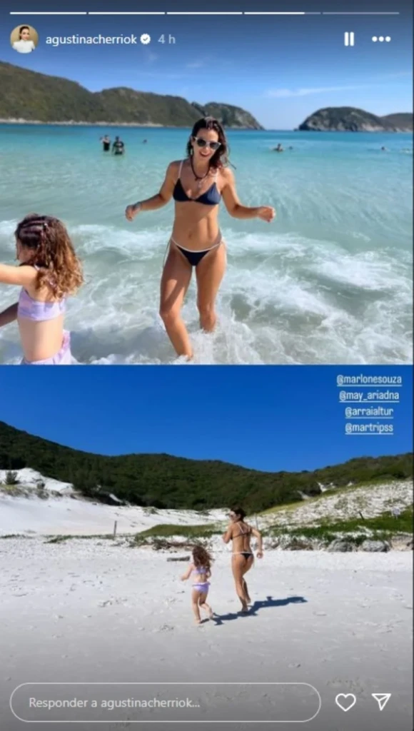 Durante sus maravillosas vacaciones en Brasil, una de las imágenes que compartió Agustina la tiene a ella como protagonista. Se la puede ver disfrutando del mar. Acto seguido, en otra foto sale jugando y corriendo con su hija por la playa.