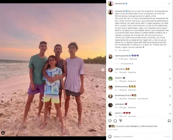 Fue la DJ quien escribió en sus redes. "El amor se transforma. Por siempre seremos familia Nahuel Mutti". Mientras que Mutti por su parte posteó: "Familia, los caminos se abren en la búsqueda de seguir evolucionando cada uno en lo personal y en conjunto familiar porque la sangre es solo la nuestra, única”.