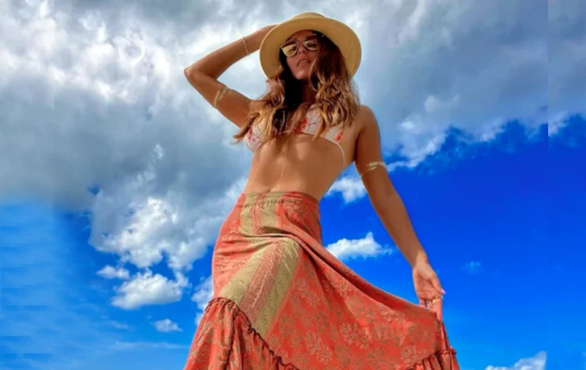 Así, la cordobesa posteó una serie de imágenes en la arena con un look muy peculiar, con una falda amplia del estilo hippie chic, además de un sombrero playero muy canchera y además con la particularidad de impregnarse unos tatuajes temporales en color dorado.