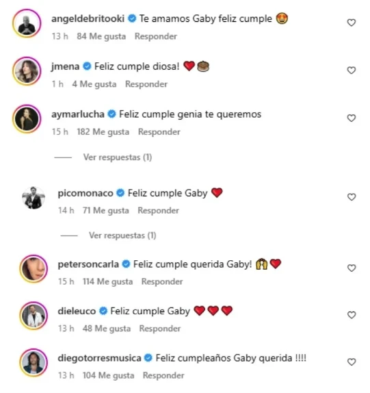 "Te amamosGaby, feliz cumple", le puso Ángel de Brito. Otra de las mejores deportistas del país, como Luciana Aymar, también le comentó: "Feliz cumple genia, te queremos". Así se amontonaron salutaciones de figuras como Carla Peterson, Diego Torres, Jimena Barón, Diego Leuco y otros.