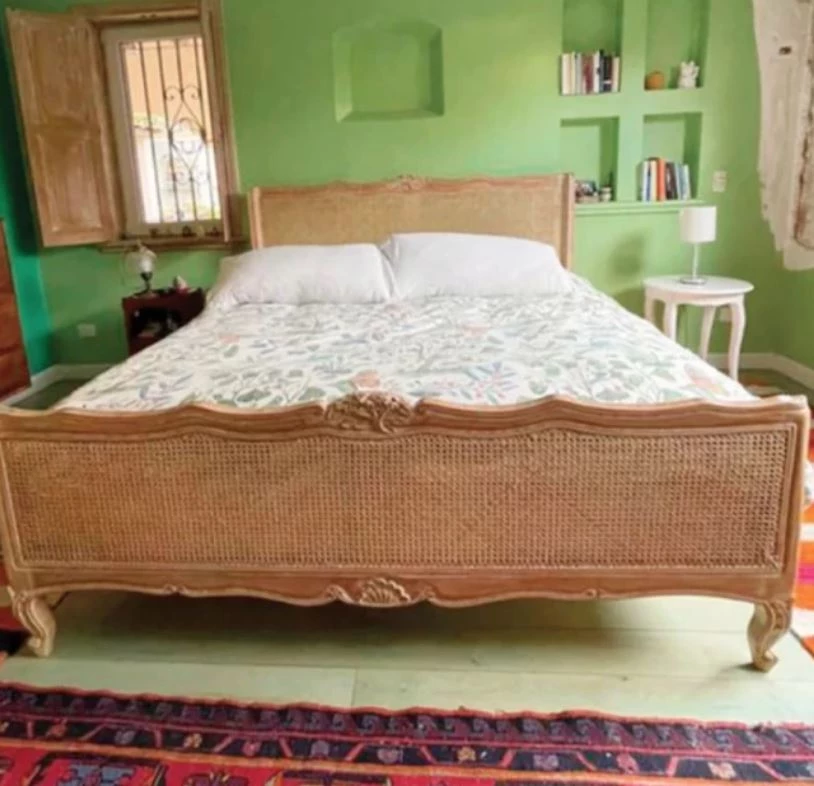La habitación de Juanita, muy luminosa y color verde claro en la gama de los manzanas, ese tono tan de moda en los años dos mil, combina modernidad y muebles más clásicos, como su cama de madera lavada y esterrilla y mesitas de luz, todas de un estilo diferente, jugando con los contrastes.