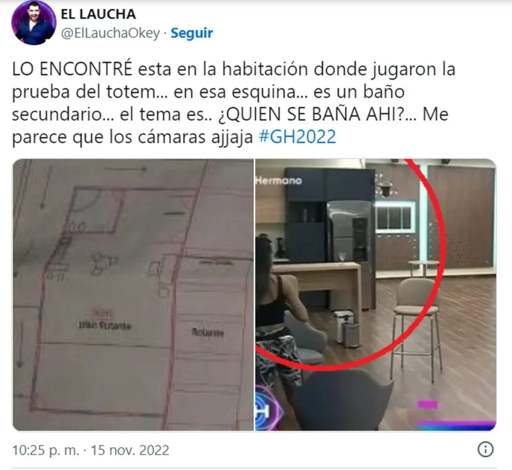"Lo encontré. Está en la habitación donde jugaron la prueba del totem. En esa esquina es un baño secundario. El tema es ¿quién se baña ahí? Me parece que los cámaras", agregó junto a las fotos que muestran el lugar exacto en el que se encuentra el baño.