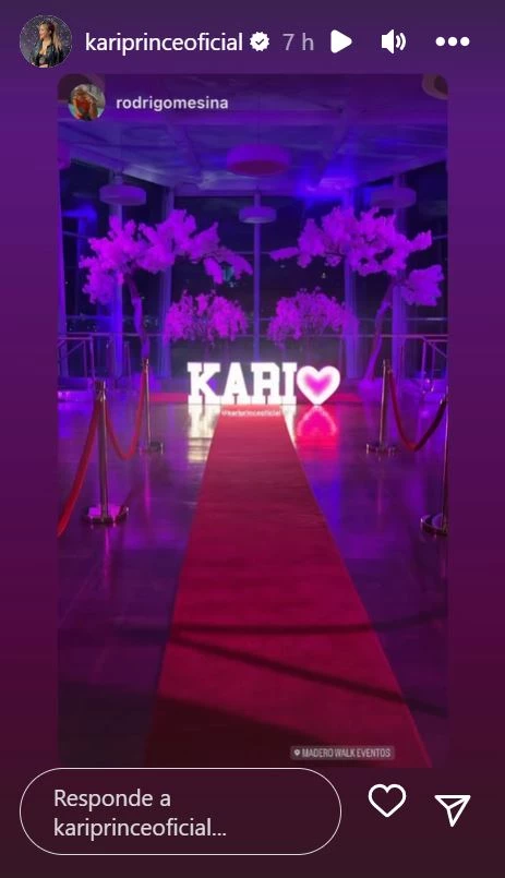 A lo largo de la fiesta Karina fue subiendo un sinfín de videos e instantáneas a sus historias de Instagram desde el lugar elegido, Madero Walk, ambientado en su honor en tonos fucsia, con varias luces de neón y un gran cartel con su nombre y un corazón.