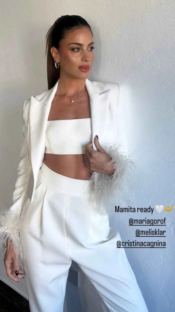 Para la ocasión, Agustina Casanova lució impecable con un total look blanco de la diseñadora María Gorof, compuesto por un blazer, top y pantalón sastrero. Completó su outfit con una cola alta prolija y accesorios dorados minimalistas, logrando un estilo moderno, elegante y sobrio.