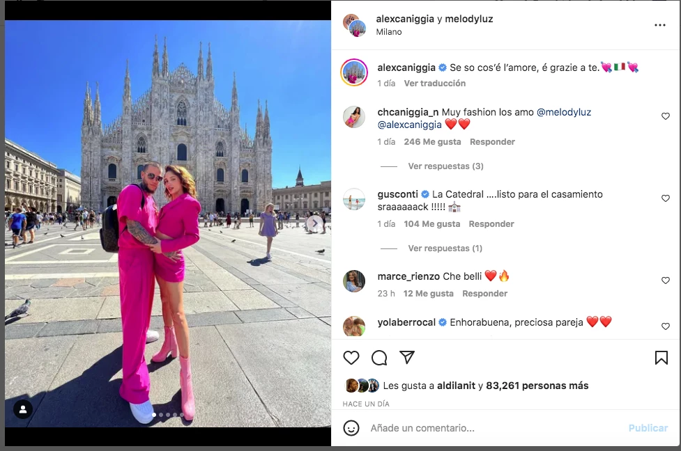 En otro sentido, Alex abrió su corazón de par en par en esa publicación de imágenes en sitios emblemáticos de Milán junto a Melody, dado que escribió una declaración potente: “Si se lo que es el amor es gracias a ti”. Un mensaje sorpresivo y que permite dimensionar la seriedad de esta relación.