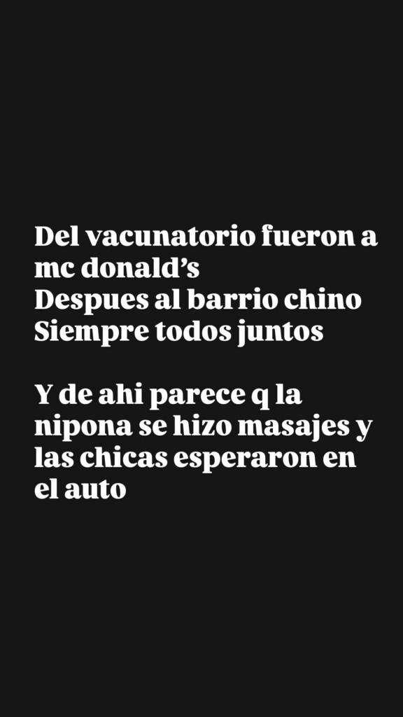 “Del vacunatorio fueron a un Mc Donald´s, después al Barrio Chino, siempre todos juntos, y de ahí parece que la nipona se hizo masajes y las chicas esperaron en el auto", reveló Yanina y agregó: “Todo una cosa de locos, sacrificar así a las niñas, ¿eso es pasar tiempo de calidad con ellas?”.