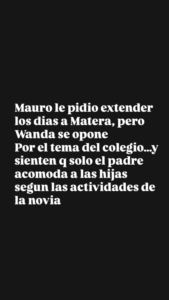 "Mauro le pidió extender los días a Matera, pero Wanda se opone por el tema del colegio, y sienten que solo el padre acomoda a las hijas según las actividades de la novia", contó Yanina en sus redes, antes de contar un lamentable episodio que vivieron las nenas a causa de la China después de que Icardi las lleve a vacunar.