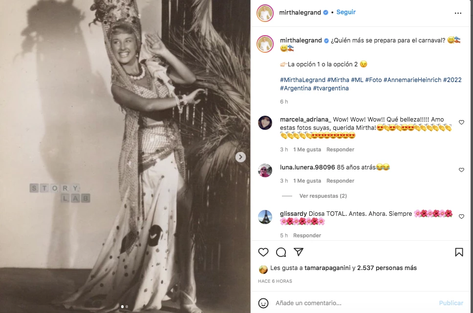 Así, Mirtha decidió jugar con este periodo del año que se caracteriza por la celebración de los carnavales, en distintos puntos del país. De ese modo, Legrand compartió dos postales de muchos años atrás, en los que luce espléndida con disfraces muy coloridos.