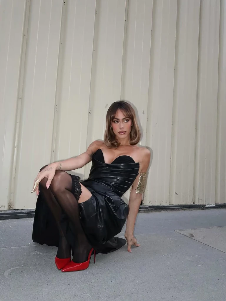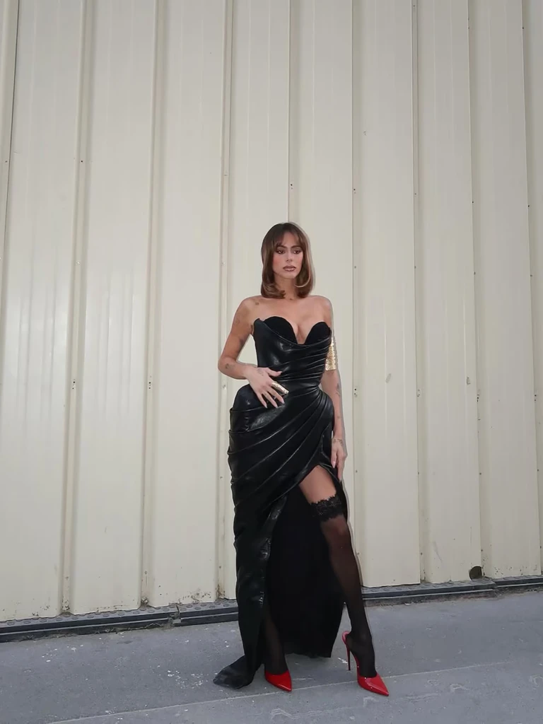 Además, también usó un vestido negro con brillo tipo cuero, bien al estilo ochentoso pero con onda actual. El look tenía mucha actitud y mezclaba texturas. Lo combinó con unos stilettos rojos de charol. Como detalle final, sumó un brazalete dorado grande en el brazo izquierdo.