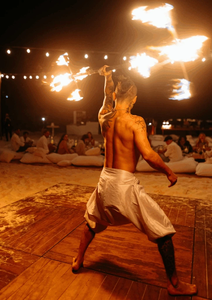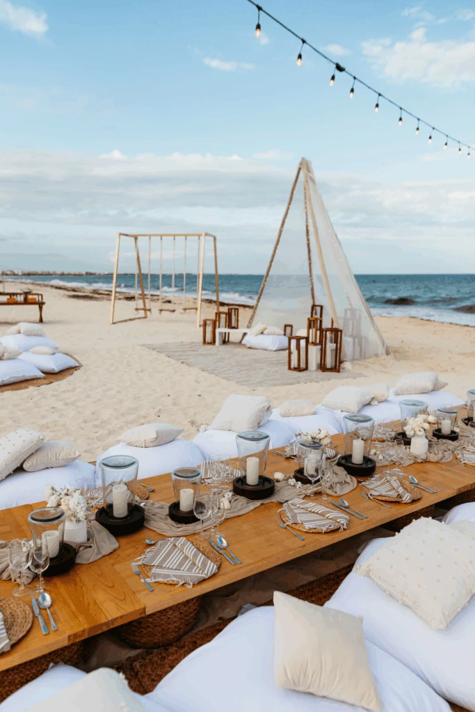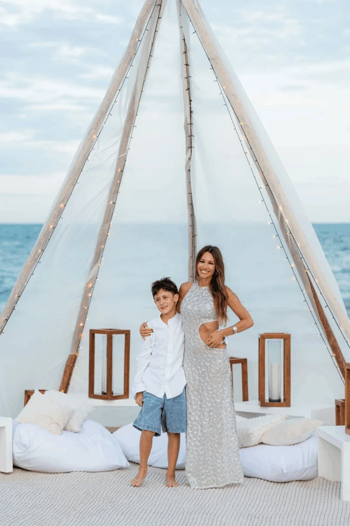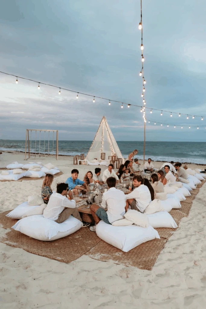 El festejo fue al aire libre, con almohadones blancos y cojines bajos dispuestos alrededor de la mesa principal, carpas rústicas iluminadas con luces cálidas y sillones de playa que invitaron a disfrutar sin formalidades. Cuando cayó el sol, una fogata frente al mar sumó calidez y creó algunas de las postales más comentadas del cumpleaños.