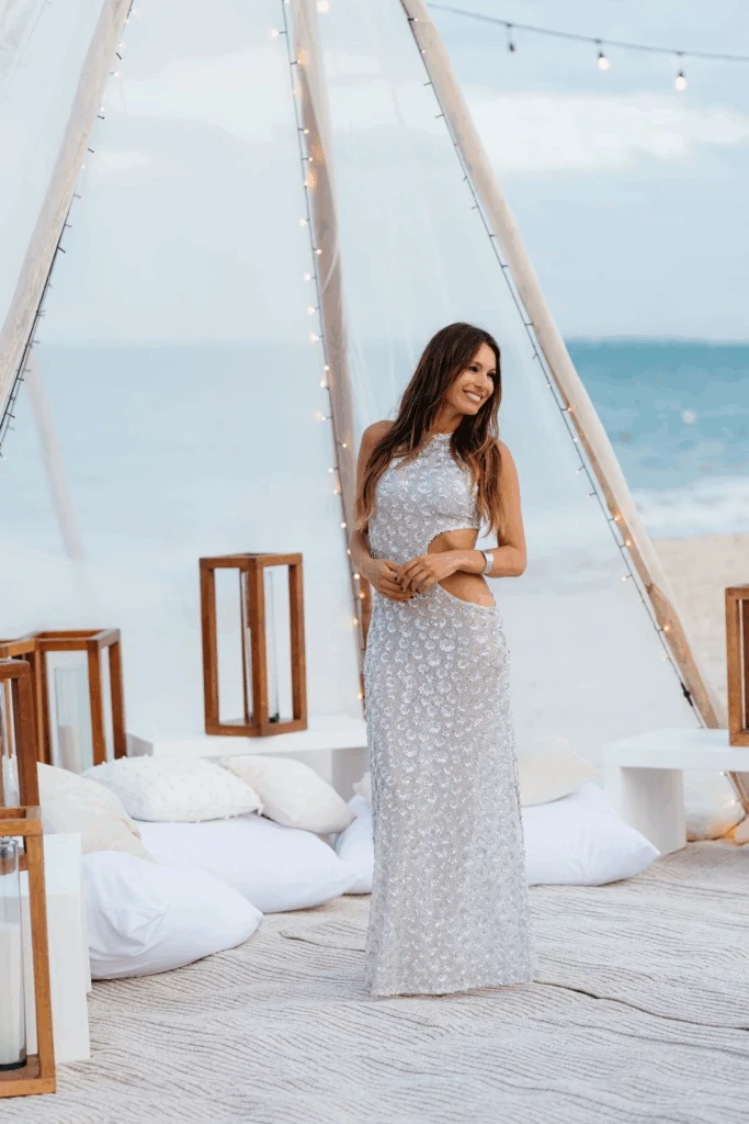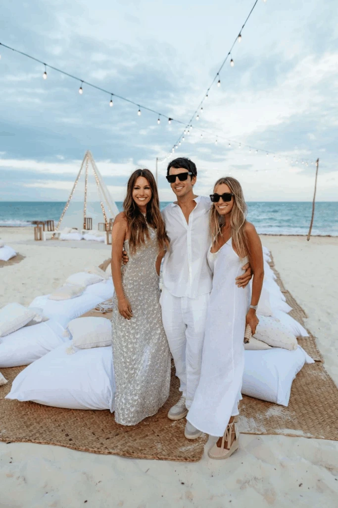 El cierre fue digno de una celebración soñada: un show de fuego iluminó la playa y selló una velada que combinó naturaleza, emoción y belleza en partes iguales. Pampita, radiante, lució un look en clave costera, delicado y elegante, que acompañó a la perfección la estética del evento.