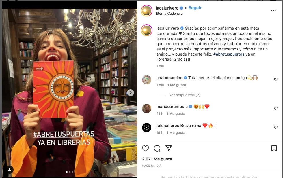 La publicación de Rivero reza una descripción de su alegría por la salida de este texto: “Gracias por acompañarme en esta meta concretada. Siento que todos estamos un poco en el mismo camino de sentirnos mejor, mejor y mejor”.
