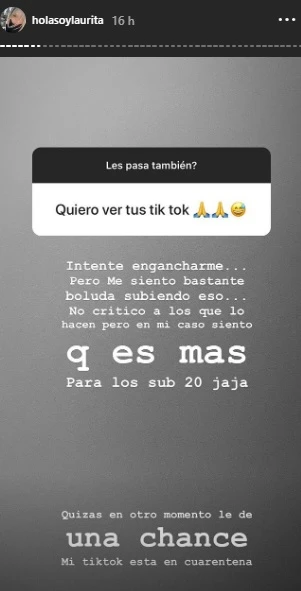 Por último, Laurita dejó abierta la puerta a usar la aplicación más adelante. "Intenté engancharme pero me siento bastante boluda subiendo eso. No critico a quienes lo hacen pero en mi caso siento que es más para los sub 20. A lo mejor en otro momento le de una chance, por ahora mi TikTok está en cuarentena", cerró.