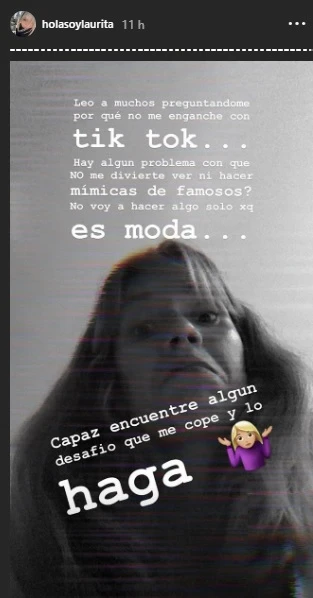 Como antídoto para el bajón, sus admiradores le propusieron que probara con Tik Toc, la aplicación de moda entre muchas celebridades. Sin embargo, Laurita admitió que no se siente atraída por ese juego.