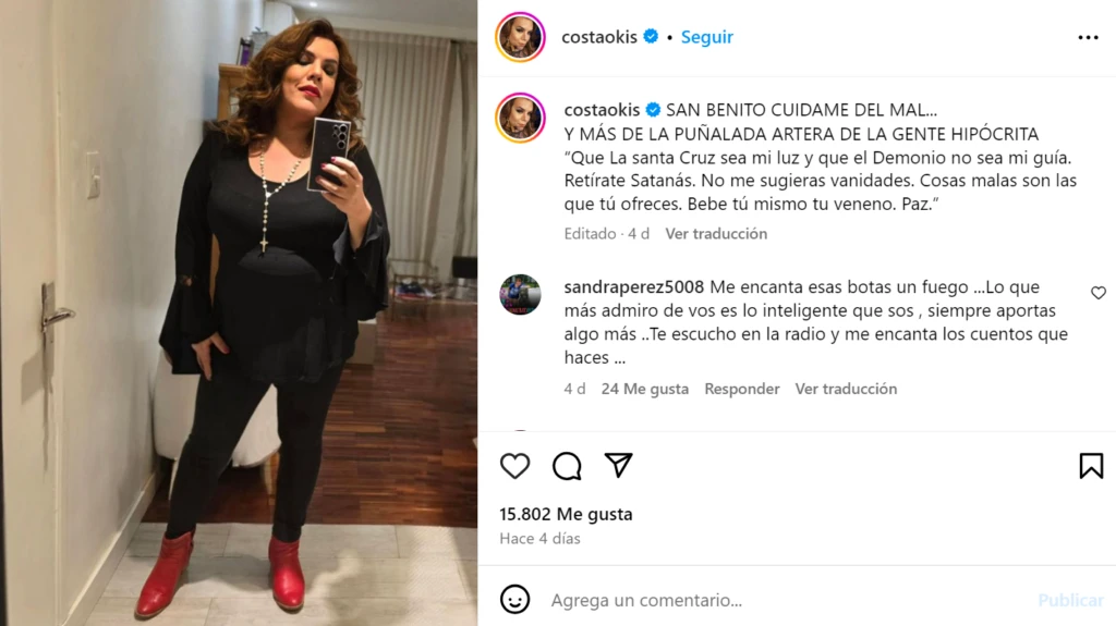 Todavía re caliente y triste por haber sido bajada de la obra, Costa hizo un llamativo posteo con un rosario colgado y botas rojas. Pero lo más peculiar fue su mensaje, una oración a San Benito que se usa en los exorcismos. “San Benito cuídame del mal y más de la puñalada artera de la gente hipócrita”, escribió.