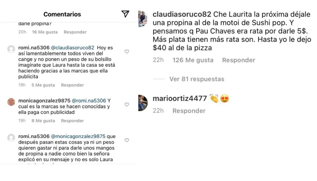 "Che Laurita, la próxima dejale una propina al de la moto de Sushi Pop. Y pensamos que Paula Chaves era rata por dejarle cinco pesos. Más plata tienen, más rata son. Hasta yo le dejo $40 pesos al de la pizza", escribió un usuario.
