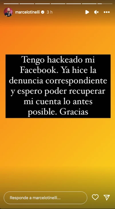 "Tengo hackeado mi Facebook. ya hice la denuncia correspondiente. espero poder recuperar mi cuenta lo antes posible. Gracias", anunció Tinelli, desde su IG, a fin de que la mayor cantidad de gente posible, se entere de lo que le pasó.
