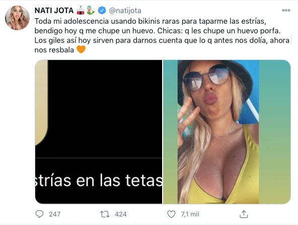 “Muchas estrías en las tetas” fue la frase repudiable que le apuntó por mensaje privado un seguidor a la periodista, el cual fue utilizado por Nati para demostrar su cambio de actitud ante este tipo de críticas: "Toda mi adolescencia usando bikinis raras para taparme las estrías, bendigo hoy que me chupe un huevo. Chicas: que les chupe un huevo porfa. Los giles así hoy sirven para darnos cuenta que lo que antes nos dolía, ahora nos resbala”.