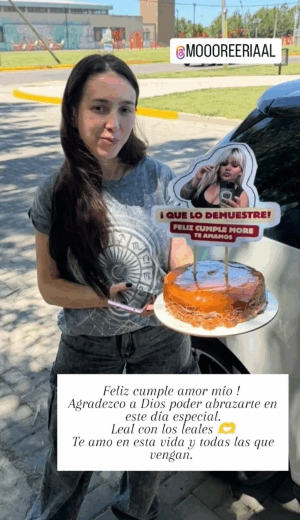 La torta que llevó Virginia también tuvo un fuerte simbolismo. Decorada con una imagen de Morena Rial, llevaba una leyenda que decía: “Que lo demuestre. Feliz cumple, te amamos”. El pastel fue realizado por Victoria Leiro, pareja del abogado de Morena, un detalle que dejó en evidencia el acompañamiento del entorno más cercano a la influencer.
