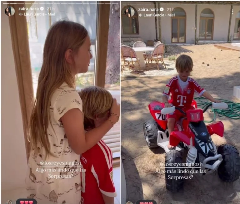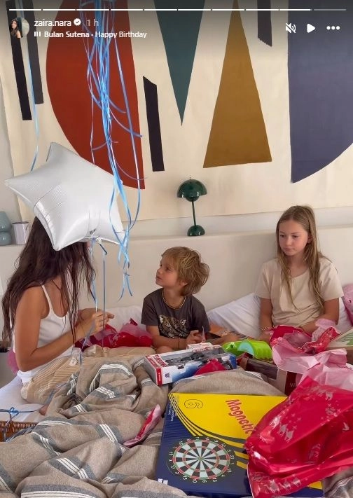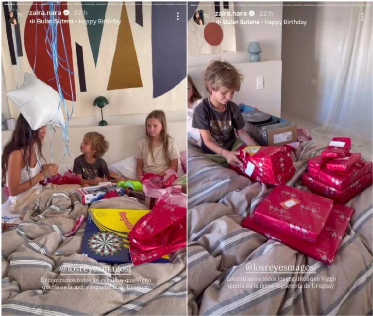Desde temprano, el pequeño fue sorprendido en la intimidad del hogar. Según dejó ver Zaira en sus historias de Instagram, Viggo despertó rodeado de paquetes rojos que contenían “todo lo que había pedido” para su cumpleaños. Emocionado, abrió uno por uno los regalos mientras su hermana Malaika lo acompañaba, cómplice y atenta a cada reacción.
