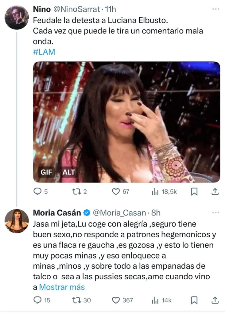 “Jaja mi jeta, Lu coge con alegría ,seguro tiene buen sexo, no responde a patrones hegemonicos y es una flaca re gaucha, es gozosa, y esto lo tienen muy pocas minas. Y eso enloquece a minas, minos, y sobre todo a las empanadas de talco, o sea, a las pussies secas. Amé cuando vino a Leloir en modo mucama para nota en Paparazzi. Banco”, escribió la Diva en la X.