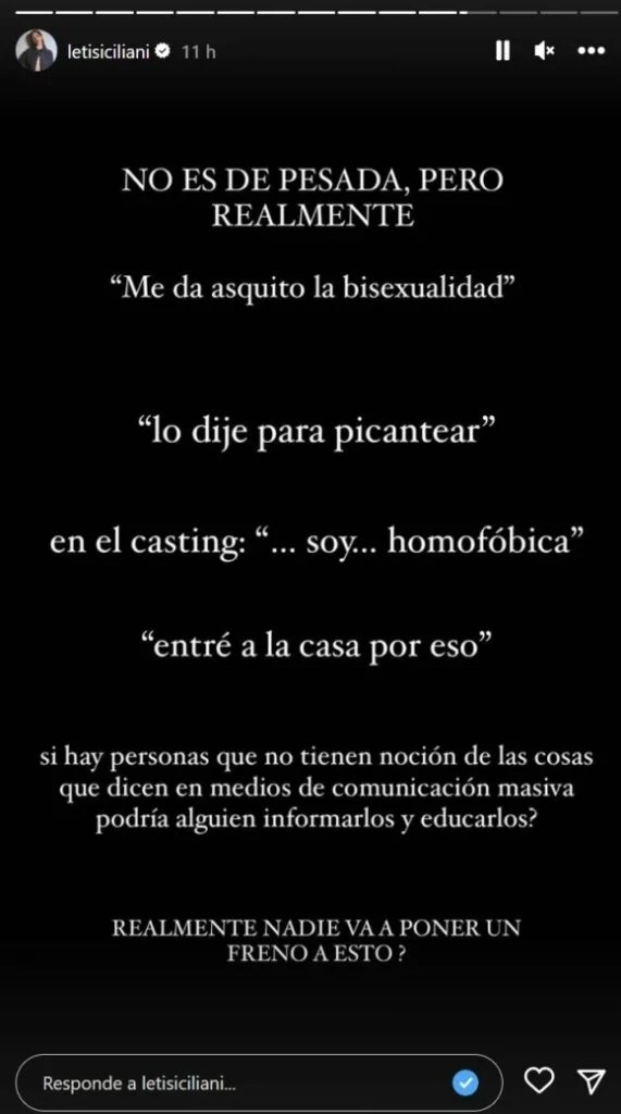 Ahora bien, quien se mostró en contra fue nada más ni nada menos que Leticia Siciliani. Mediante su cuenta de Instagram, la actriz apuntó fuerte contra Martina y la destrozó: "No es de pesada, pero… 'Lo dije para picantear', 'Me da asquito la bisexualidad', 'Soy homofóbica', 'Entré a la casa por eso'...".