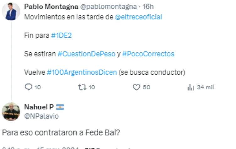 El reconocido periodista de espectáculos, Pablo Montagna, anunció a través de sus diferentes redes sociales, la noticia que retumba en los pasillos del canal. El anuncio no dejó contentos a algunos televidentes que se expresaron en el twitter del comunicador, expresando por ejemplo "¿Para eso contrataron a Fede Bal?", ya que no seguirá el programa.