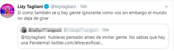Cuando un usuario le escribió “hubieras pensado antes de invitar gente, ¡no sabías que hay una pandemia!”, ella retrucó enojada: “Sí, como también sé que hay gente ignorante como vos sin embargo el mundo no deja de girar”.