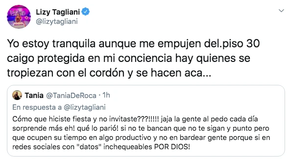 Frente a esta última versión, dada a conocer ayer por el periodsita Augusto Tartufoli, la propia Lizy, quien se encuentra aislada desde hace 10 días después de que su hisopado confirmara que tiene coronavirus, ensayó una dramática defensa.
