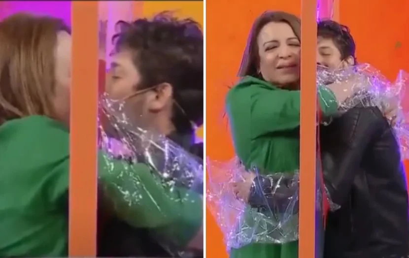 Al sacarse la venda de los ojos pudo visualizar a su novio en la tribuna, el joven bajó rápidamente y la saludó con el codo. Luego llegó el momento más esperado, a través de una estructura plástica la pareja se pudo abrazar y besar respetando los protocolos sin ponerse en riesgo.