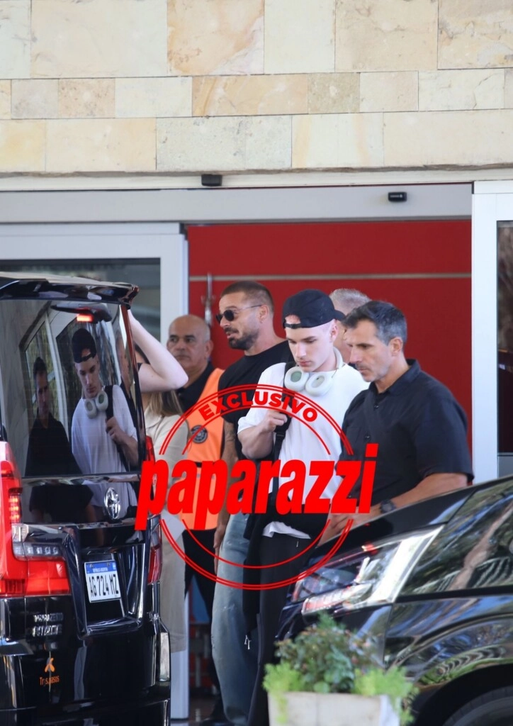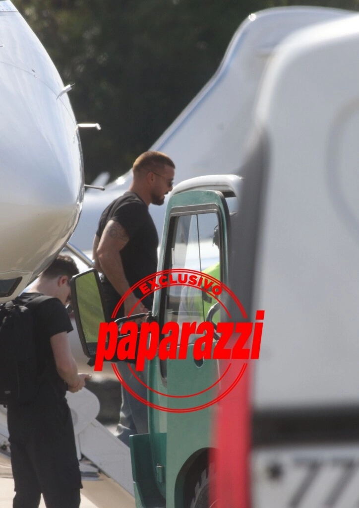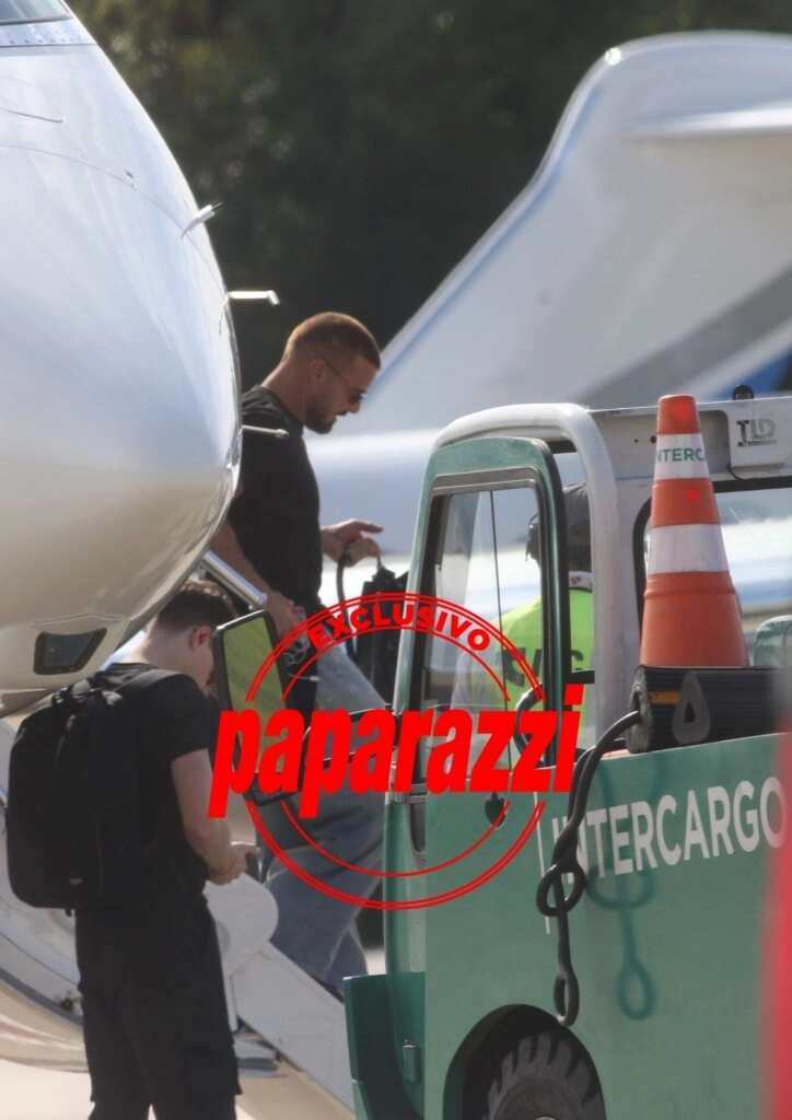El arribo se produjo en la terminal FBO, exclusiva para vuelos privados, con una demora de aproximadamente dos horas. Acompañado por sus hijos mellizos, Matteo y Valentino, el cantante descendió con un look relajado y rodeado de su equipo de confianza, en medio de un operativo discreto pero muy organizado.