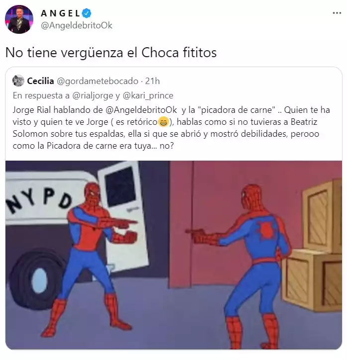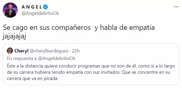 "Busca que me ataquen los fans de Karina. Nunca vi nadie tan cara rota", dijo Ángel, que luego dijo que el periodista "se cagó en sus compañeros y habla de empatía" de TV Nostra, lo trató de “panqueque”, al recordar cómo el año pasado “mató” a Karina cuando estuvo de jurado en el Cantando 2020.