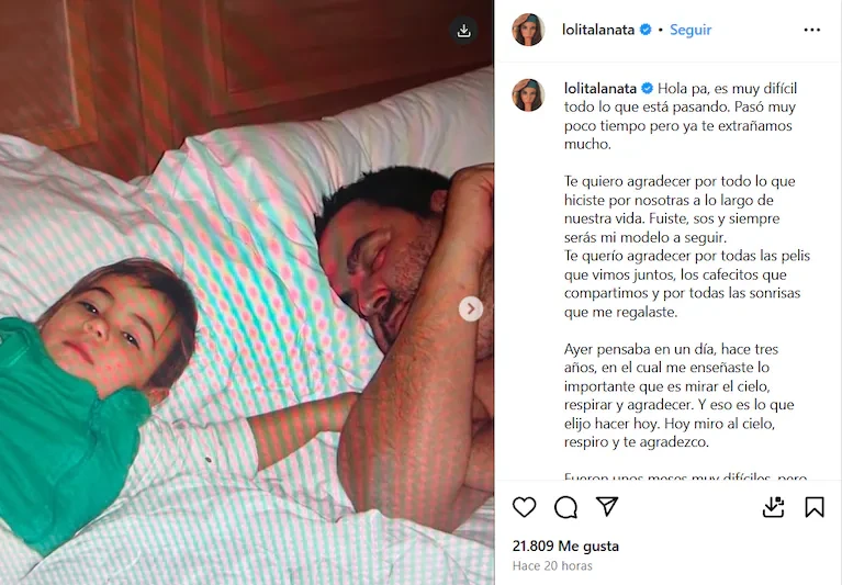 Y Lola Lanata agregó: "Ayer pensaba en un día, hace tres años, en el cual me enseñaste lo importante que es mirar el cielo, respirar y agradecer. Y eso es lo que elijo hacer hoy. Hoy miro al cielo, respiro y te agradezco. Fueron unos meses muy difíciles, pero tuvimos la suerte de no dejarnos de decirnos las cosas importantes. Como cuando me confesaste que al estar conmigo sentías paz".