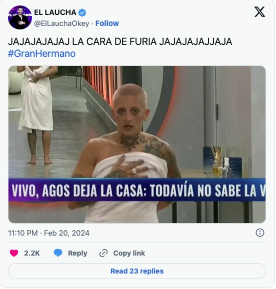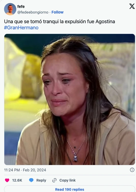 A partir de la reacción de la propia Agostina tras conocer la noticia de que tenía que abandonar el reality show, en X crearon todo tipo de imágenes con sus expresiones y con la de sus compañeros tras verla salir por la puerta que divide el programa de la realidad.